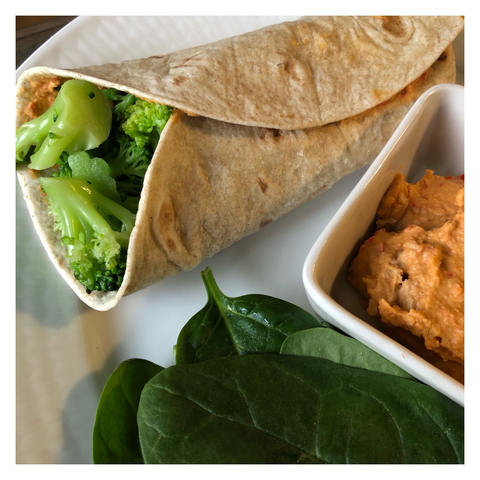 Igår var en sådan dag jag ville slänga ihop någonting snabbt till lunch. Det fick bli en wrap med  broccoli och paprikahummus.